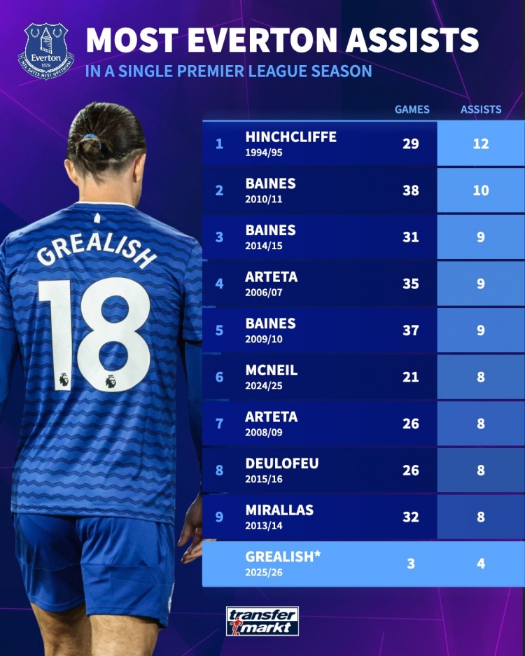 格拉利什 在 2025/26 赛季,出场 3 次,已贡献了 4 次助攻