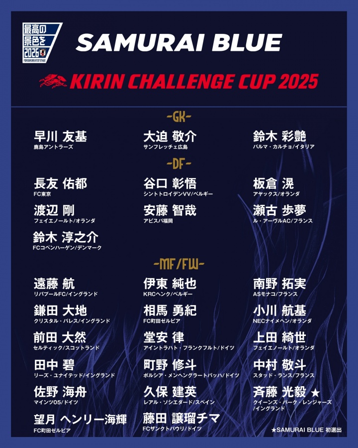 门将:早川友基(鹿岛鹿角)、大迫敬介(广岛三箭)、铃木彩艳(帕尔马)