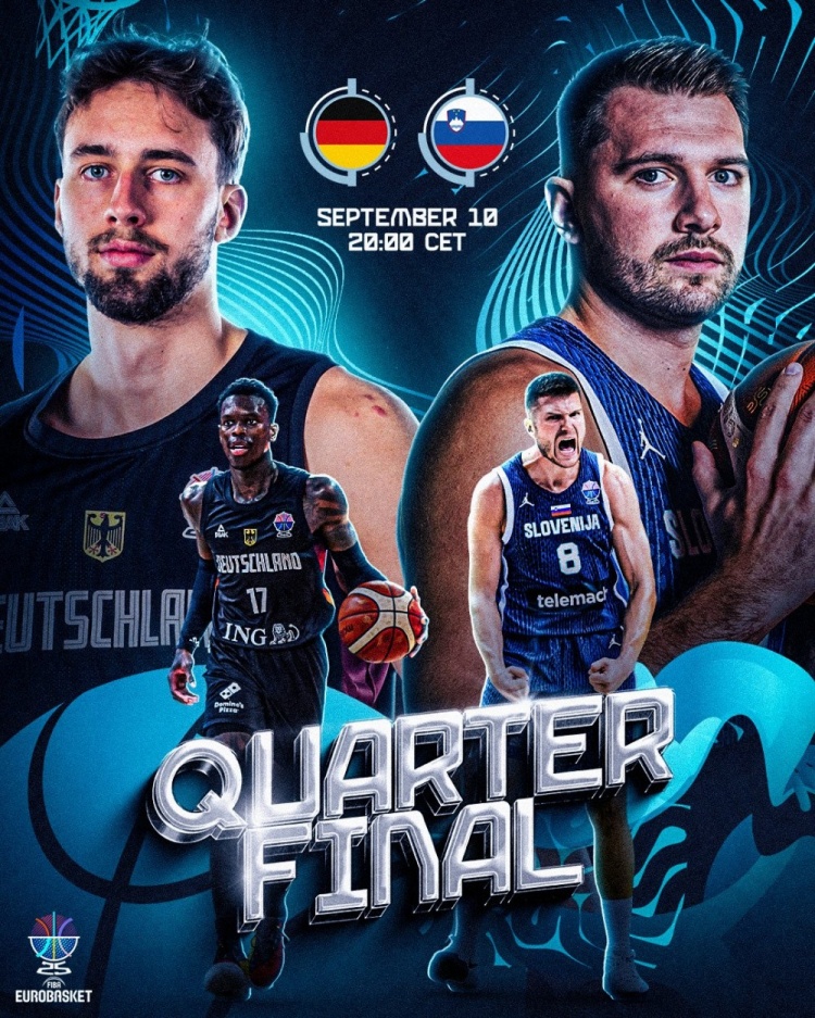 比赛开始,两队开场便陷入缠斗,德国队多点开花打出7-0的攻击波占据主动,东契奇得分助攻一肩挑,带队回应15-4的进攻高潮确立优势,次节斯洛文尼亚进攻端陷入停滞,德国连投带罚抹平分差,东契奇连得7分止住颓势,半场战罢斯洛文尼亚51-45领先德国。易边再战,东契奇被吹进攻犯规很快领到个人第4犯,但斯洛文尼亚内外开花占据场上主动,席尔瓦飙中神仙超远三分,德国队顺势轰出10-0的进攻高潮强势反超,双方争夺陷入白热化,关键时刻德国多点开花确立优势,斯洛文尼亚苦苦追赶无果。最终,德国99-91逆转力克斯洛文尼亚,挺进4强。